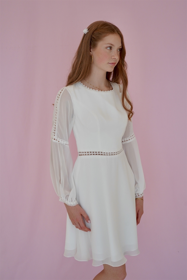 Konfirmationskjole Alberte er en elegant og tidløs konfirmationskjole i let chiffon, designet til konfirmanden der ønsker et feminint og klassisk udtryk. Kjolen har lange ærmer og smukke blondedetaljer i taljen og på ærmerne, som giver et eksklusivt og sofistikeret look – uden at det bliver for prangende.