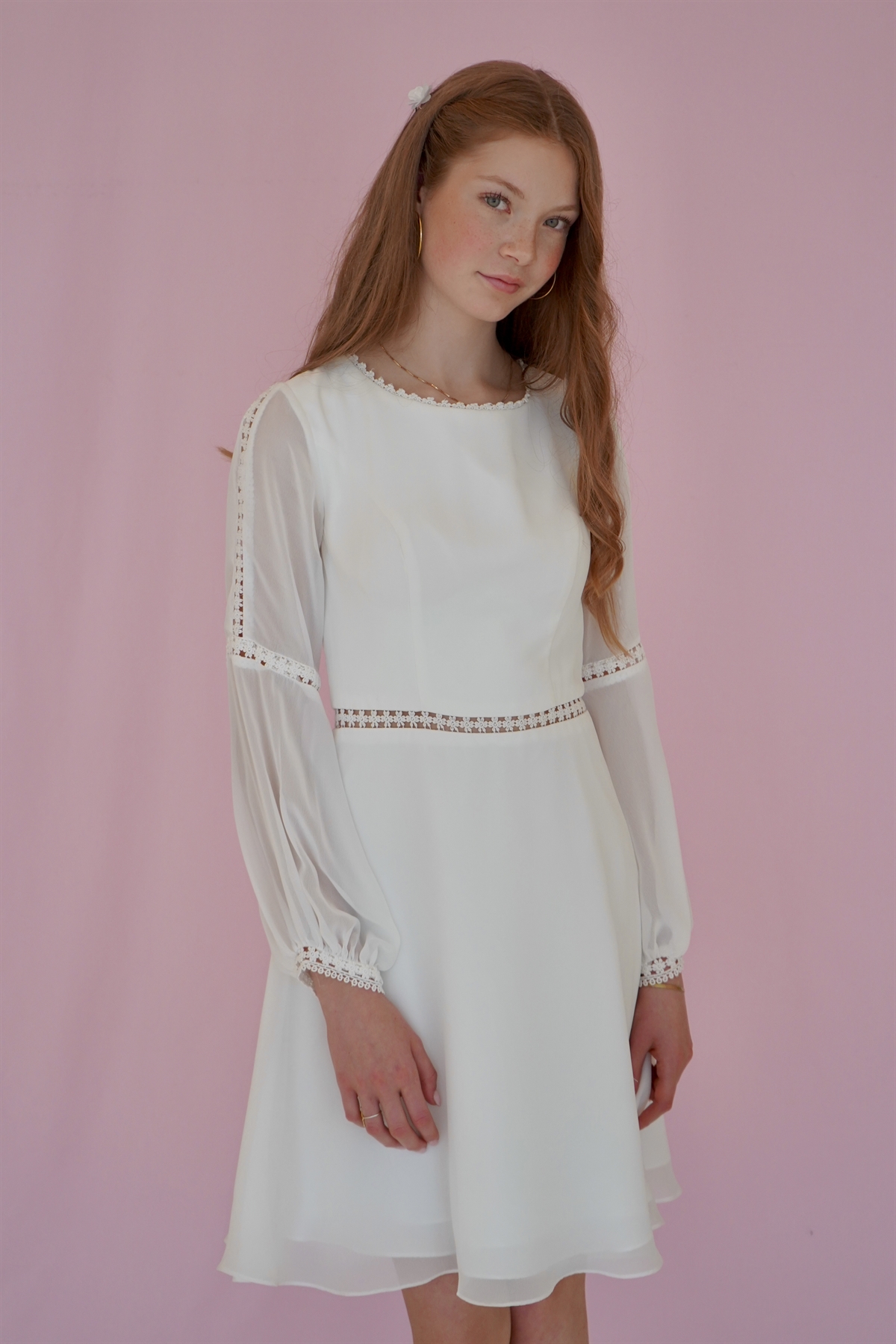Konfirmationskjole Alberte Leveringstid: Marts 2026 Varenr: 2301 Pris 1 Stk.2.999,00 DKK Vælg størrelse Vælg variant 34 36 38 40 42 44 Antal Beskrivelse Spørg til varen Konfirmationskjole Alberte i chiffon med lange ærmer, fine blondedetaljer i taljen og på ærmer. Denne kjole er en bestillingskjole som kan prøves i vores Butik/Showroom. Se Alberte video fra Catwalken form