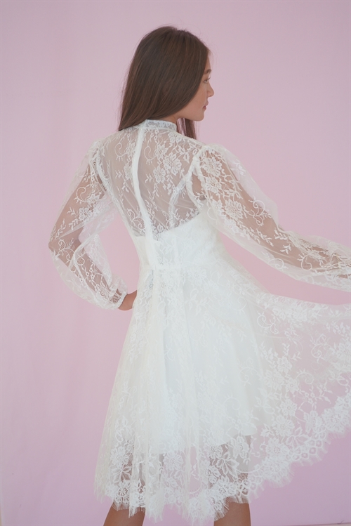 Konfirmationskjole Gry Leveringstid: Marts 2026 Varenr: 2614 Pris 1 Stk.2.499,00 DKK Vælg størrelse Vælg variant 28 30 32 34 36 38 40 42 44 46 48 50 Antal Beskrivelse Spørg til varen Konfirmationskjole Gry i blonde med høj hals og lange ærmer. Dertil stofknapper og lille slæb bagtil. Gry er her vist sammen med satinkjolen Azar. Gry kan kombineres med flere af CLARÓN's enkle satin og crepe kjoler. form