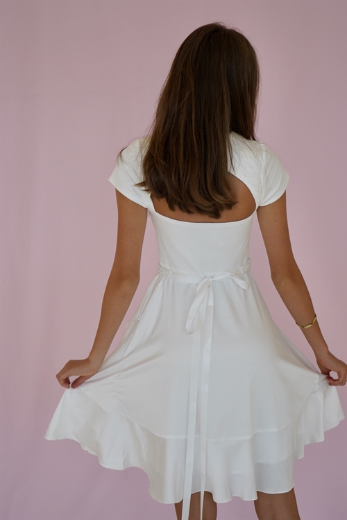 Konfirmationskjole Tilde Leveringstid: Marts 2026 Varenr: 2016 Pris 1 Stk.2.999,00 DKK Vælg størrelse Vælg variant 34 36 38 40 42 44 Antal Beskrivelse Spørg til varen Konfirmationskjole Tilde i blød satin med korte ærmer, jackie-O skæring samt kørt med bælte og flæse. Stilren og enkel konfirmationskjole med den smukkeste ryg. form Kunder købte også 2.999,00 DKK Konfirmationskjole Alba