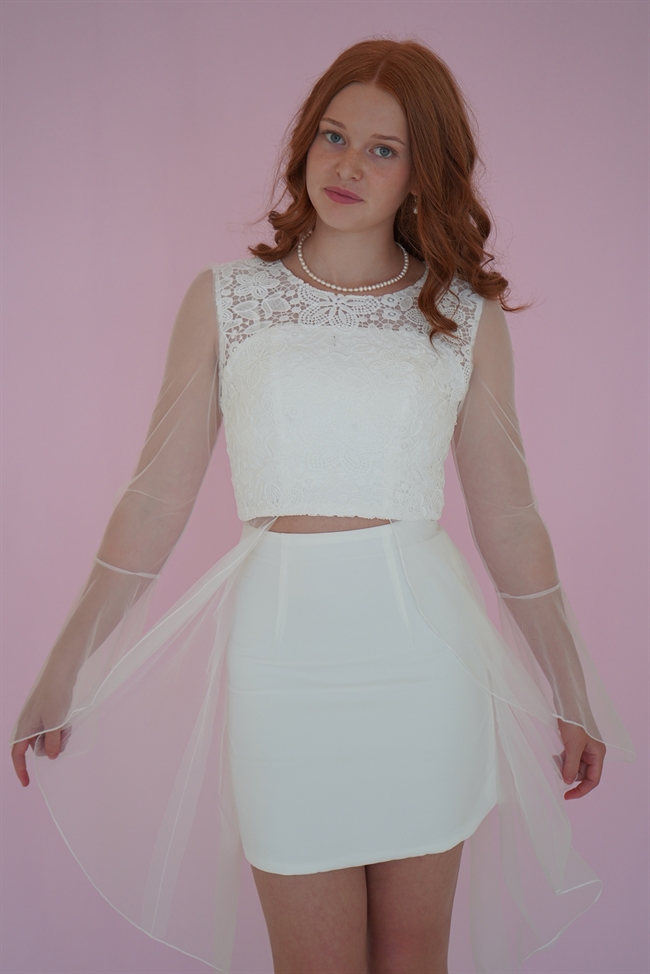 Konfirmationskjole Anastasia Leveringstid: Marts 2026 Varenr: 2422AB Pris 1 Stk.3.499,00 DKK Vælg størrelse Vælg variant 34 36 38 40 42 44 Antal Beskrivelse Spørg til varen Konfirmationskjole Anastasia er todelt med en smuk top med blonde og tyl samt separat skørt i crepe. Kan også købes separat. Denne smukke kjole kan prøves i vores Butik/Showroom. form