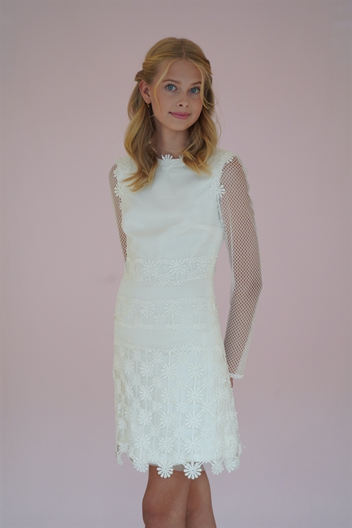 Konfirmationskjole Flora Leveringstid: Marts 2026 Varenr: 2222 Pris 1 Stk.3.299,00 DKK Vælg størrelse Vælg variant 34 36 38 40 42 44 Antal Beskrivelse Spørg til varen Konfirmationskjole Flora i smuk blonde med lange ærmer og figursyet skørt. Kjolen er en bestillingskjole Prøvemodel i butik: NEJ Genbestilling: JA form