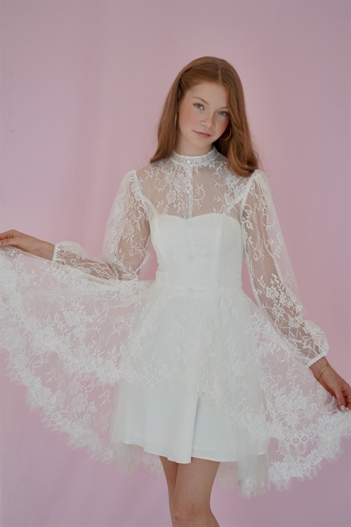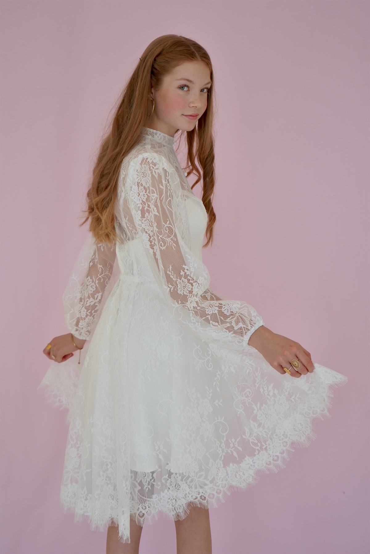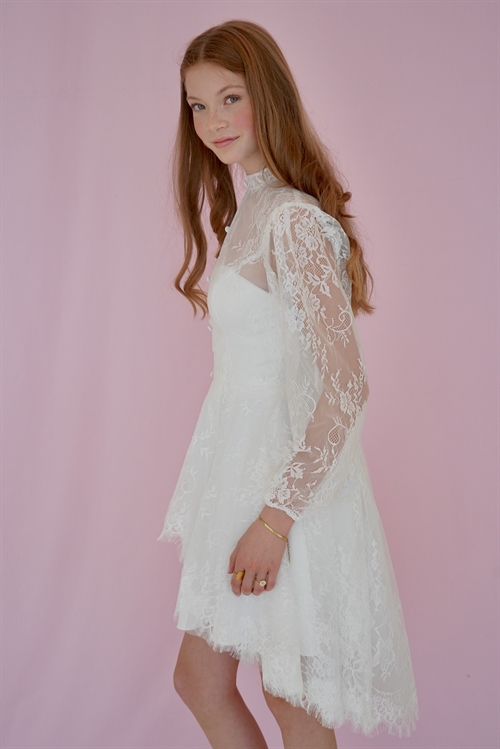 Konfirmationskjole Gry Leveringstid: Marts 2026 Varenr: 2614 Pris 1 Stk.2.499,00 DKK Vælg størrelse Vælg variant 28 30 32 34 36 38 40 42 44 46 48 50 Antal Beskrivelse Spørg til varen Konfirmationskjole Gry i blonde med høj hals og lange ærmer. Dertil stofknapper og lille slæb bagtil. Gry er her vist sammen med satinkjolen Azar. Gry kan kombineres med flere af CLARÓN's enkle satin og crepe kjoler. form