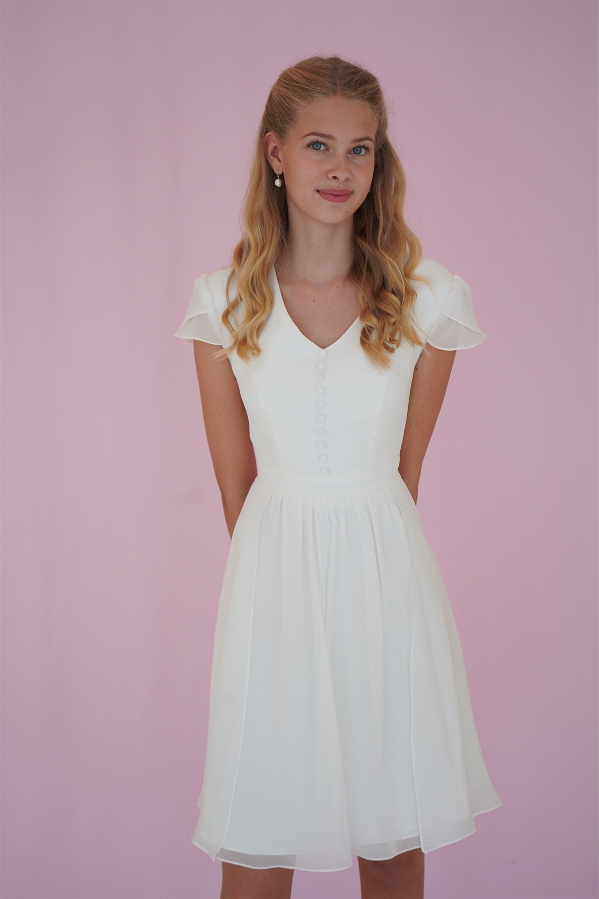 Konfirmationskjole Josefine Leveringstid: 2-5 dage Varenr: 2308 Pris 1 Stk.2.999,00 DKK Vælg størrelse Vælg variant 40 Antal Beskrivelse Spørg til varen Konfirmationskjole Josefine i chiffon med V-skæring, korte ærmer samt fyldigt skørt i A-facon. Denne konfirmationskjole er en bestillingskjole som kan prøves i vores Butik/Showroom form