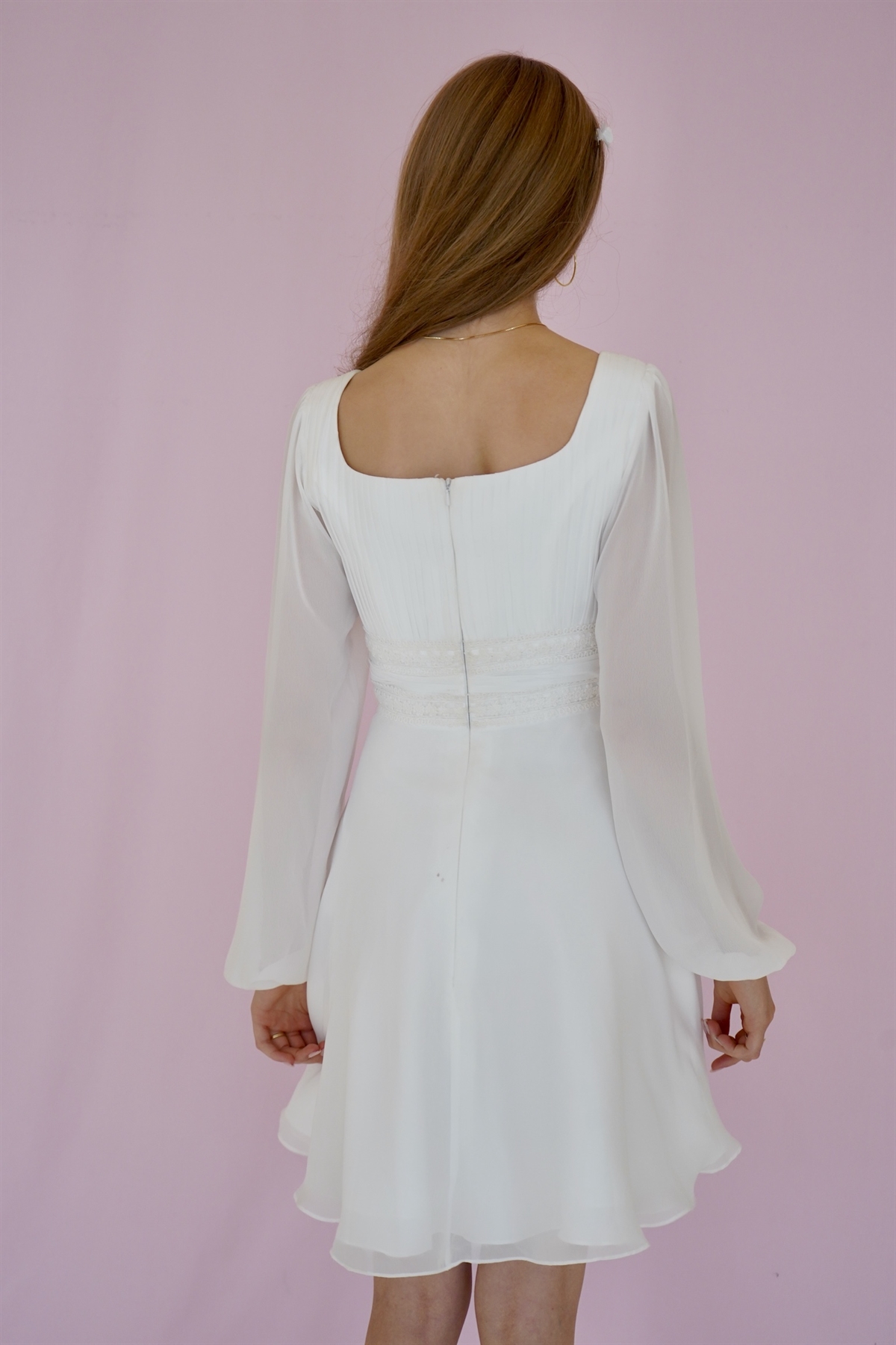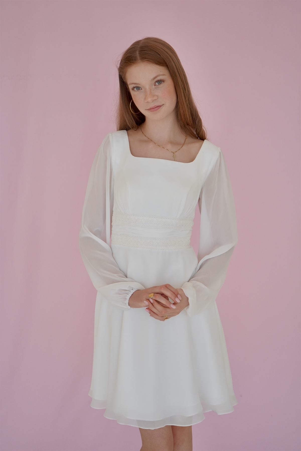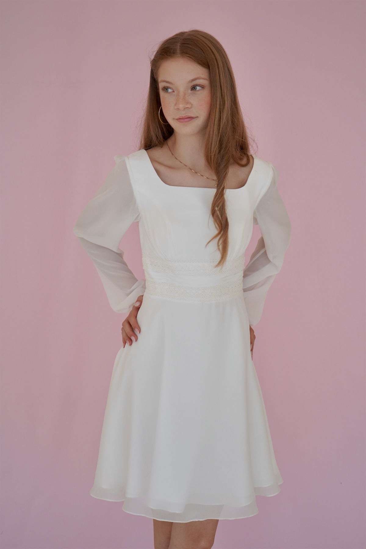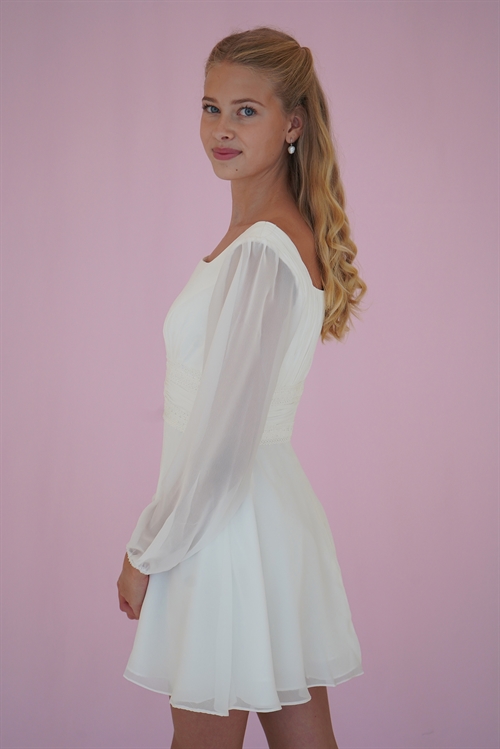 Konfirmationskjoler - Mille med flot blondetajle Leveringstid: Marts 2026 Varenr: 2303 Pris 1 Stk.2.999,00 DKK Vælg størrelse Vælg variant 34 36 38 Antal Beskrivelse Spørg til varen Konfirmationskjole Mille i chiffon med lange ærmer, bådeskæring, smukke blonde detaljer i taljen samt A-facon. Denne konfirmationskjole er en bestillingskjole som kan prøves i vores Butik/Showroom. form